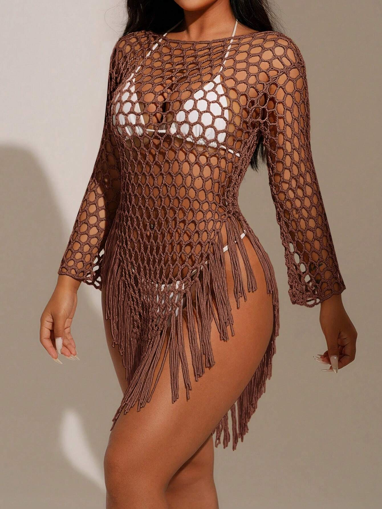 Solid Color Asymmetric Hem Sheer Fringe Beach Cover