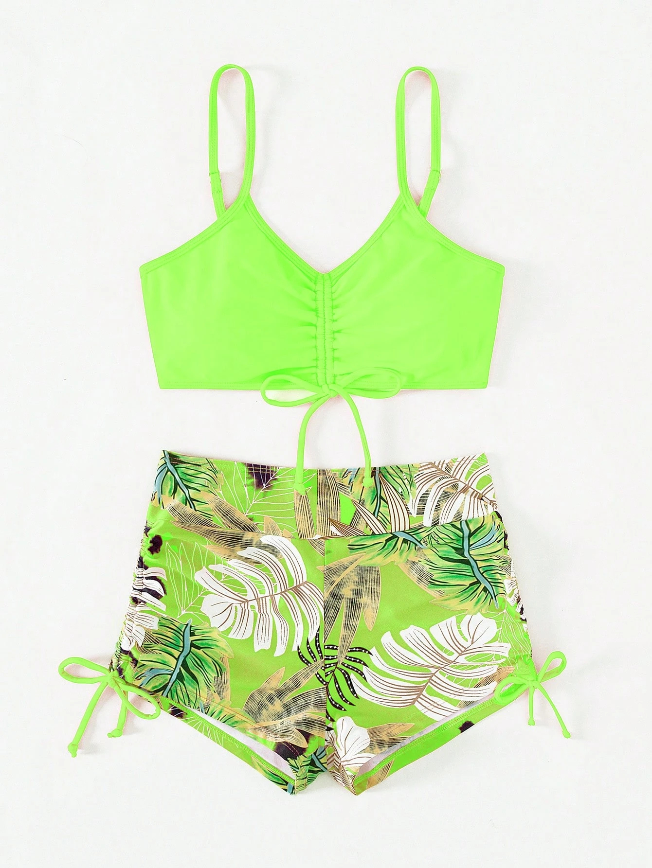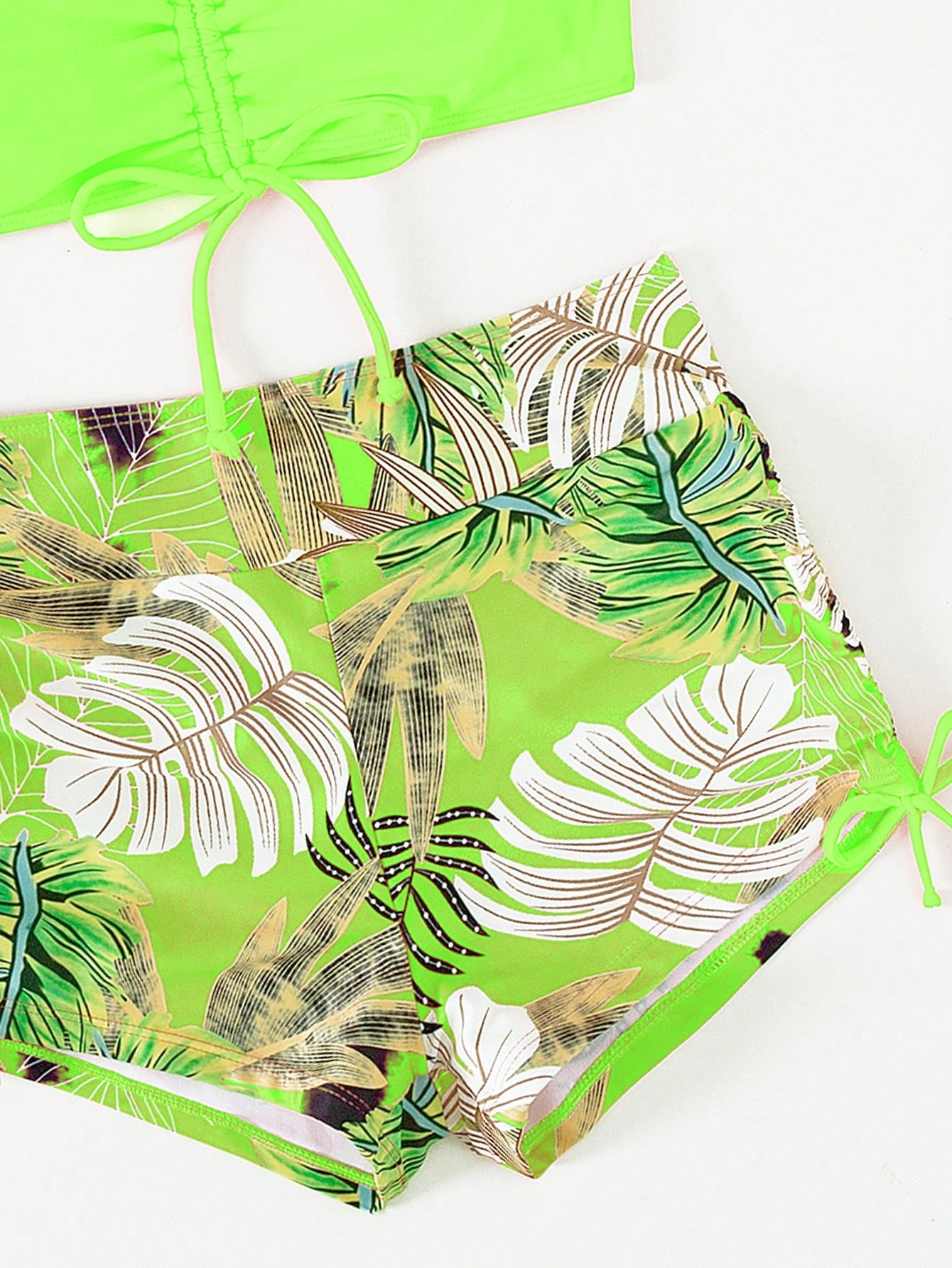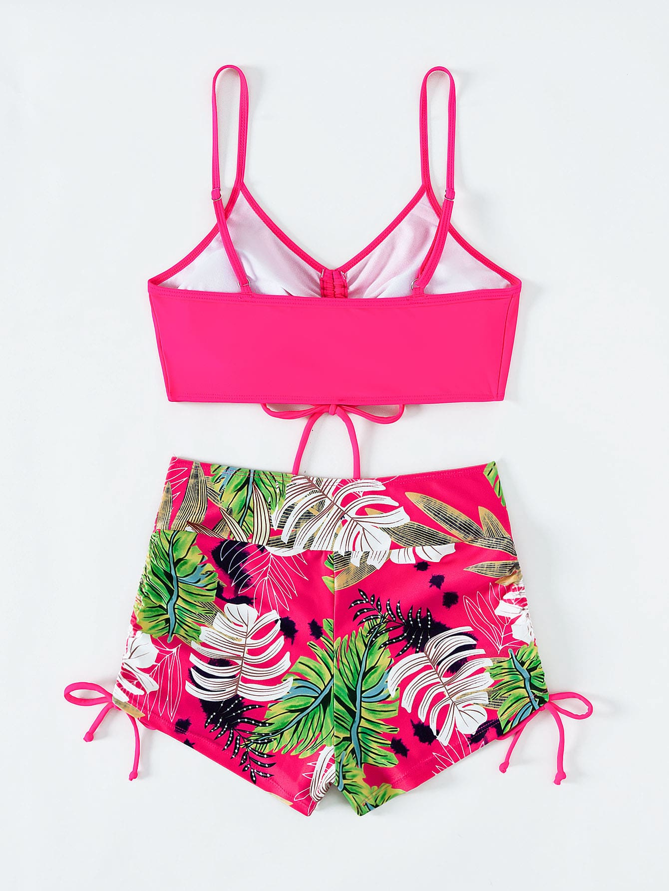 Summer Beach Tropical Print Bikini Set Drawstring Cami Bra & Boxer Shorts 2 Piece Bathing Suit