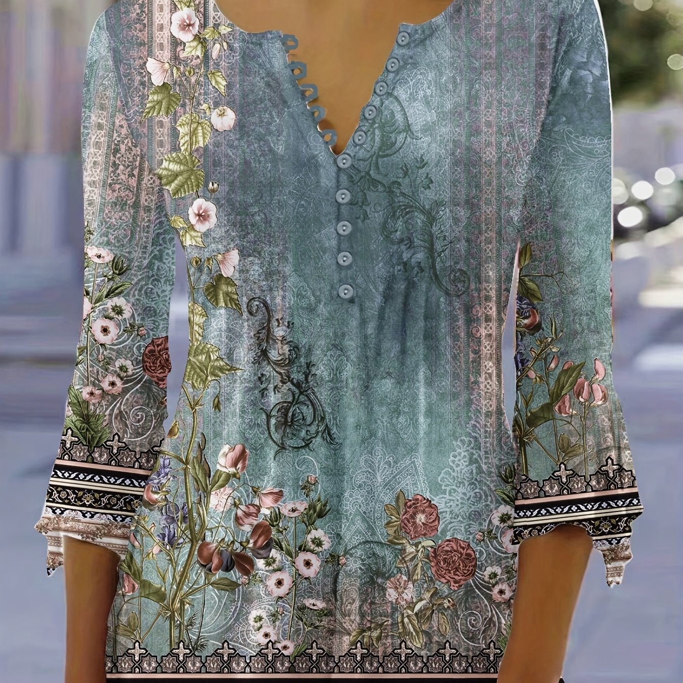Women's Floral Print Button Front V-Neck T-Shirt with Flutter Sleeves